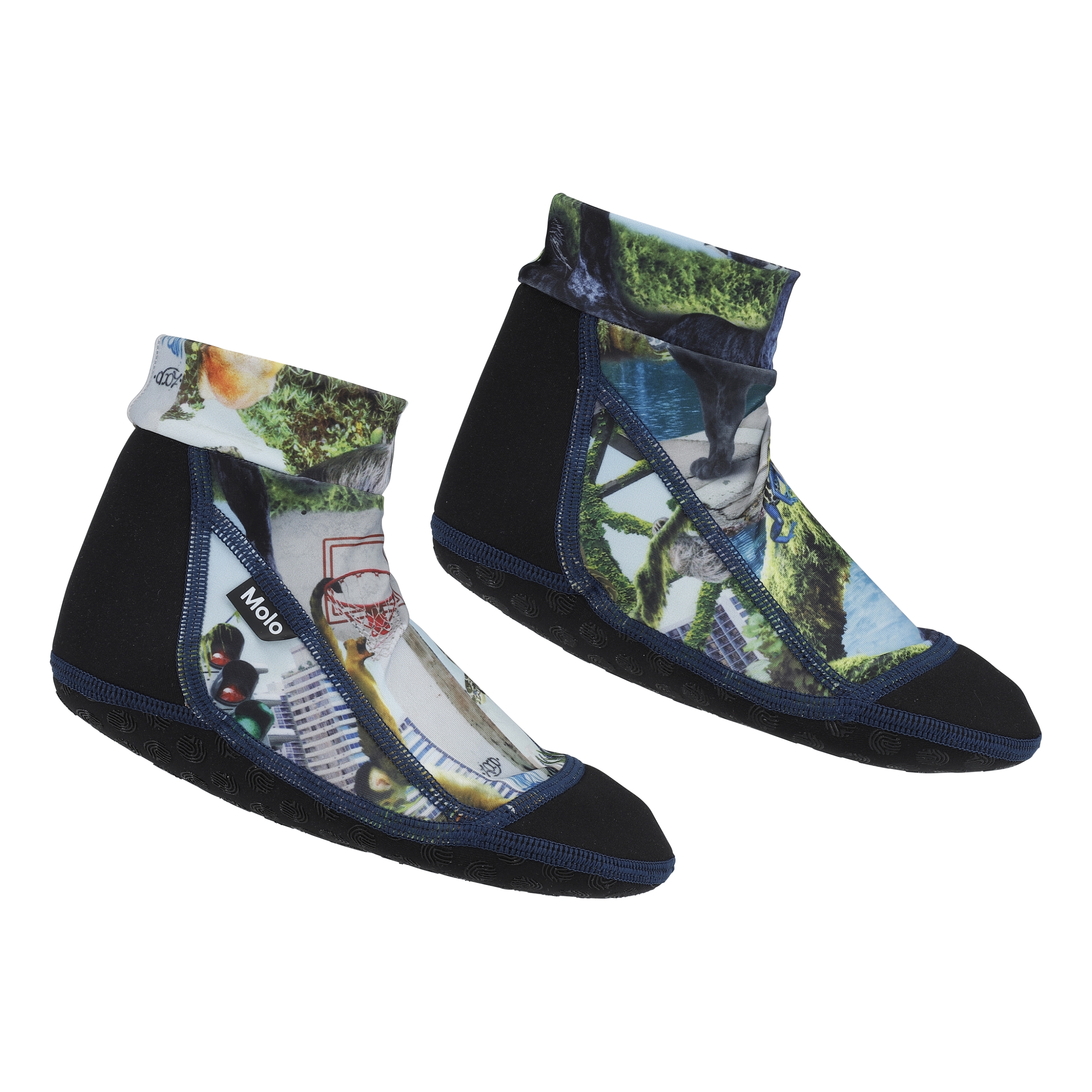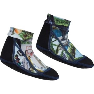 Neopreen zwemsokken beschermen kleine voeten tegen scherpe voorwerpen en heet zand. Ze zijn gemaakt in de ‘Urban Jungle’ print.