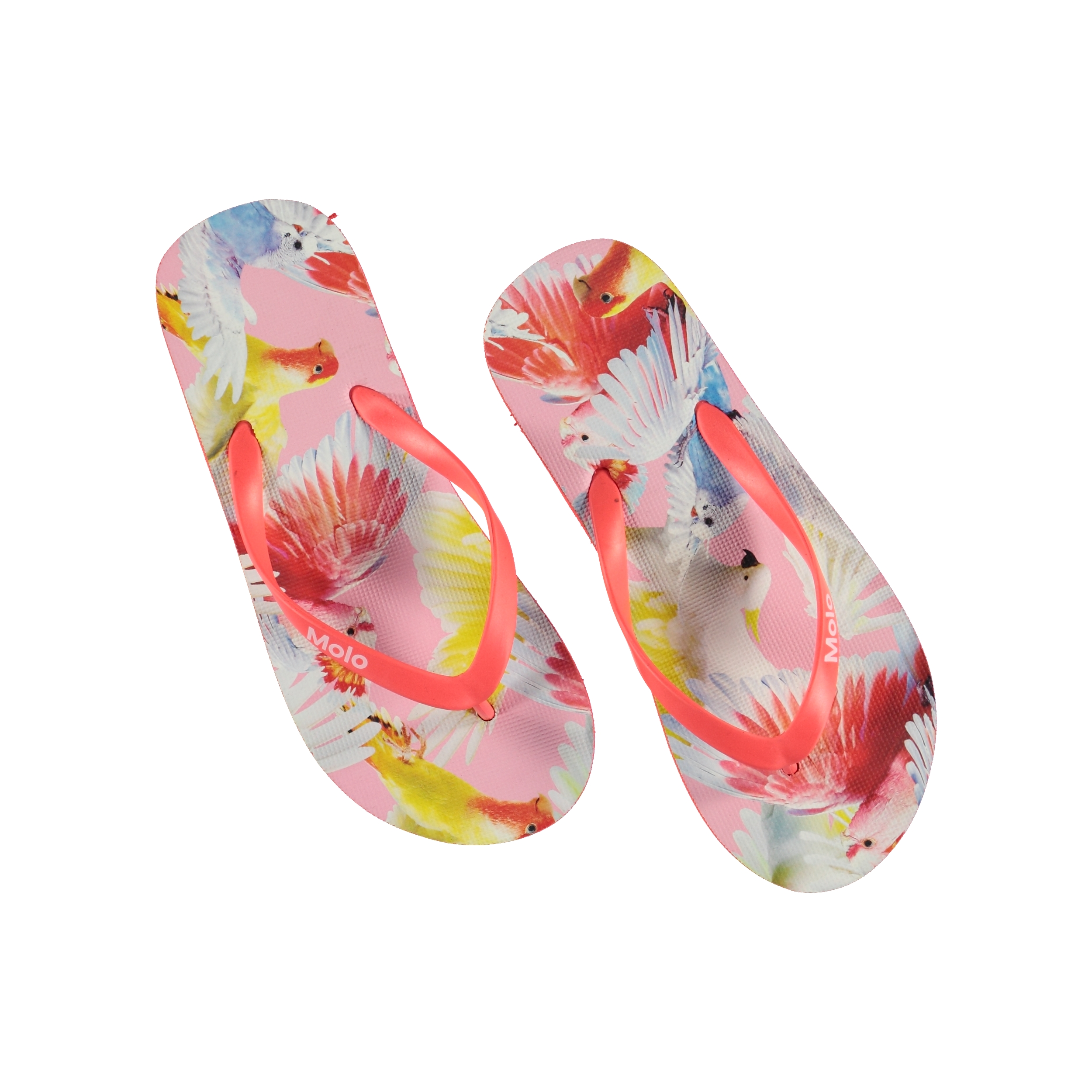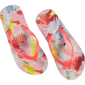 Molo's Zeppo teenslippers zijn een must om je tenen koel te houden in de zomerse hitte. Deze teenslippers zijn roze en hebben een papegaaienprint.