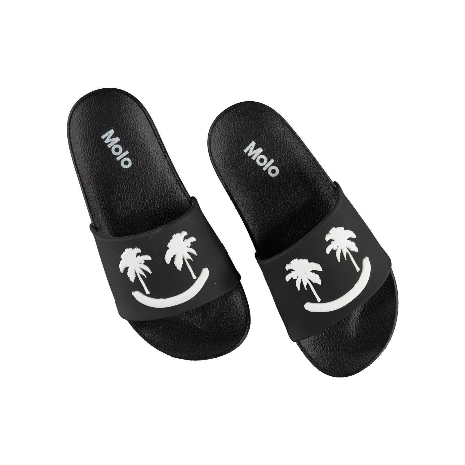 Molo's Zhappy badslippers zijn een must in de zomerse hitte wanneer je je tenen wat lucht moet geven. Deze badslippers zijn zwart met ene grappige witte palm smiley