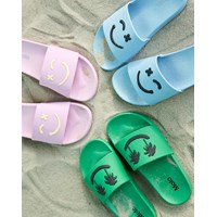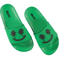 Molo’s Zhappy badslippers zijn onmisbaar in de hitte van de zomer wanneer je voeten frisse lucht nodig hebben. Deze badslippers zijn groen met grappige zwarte smiley’s van palmbomen. De sandalen hebben een elastische hielband in de maten 23/24 en 25/26.