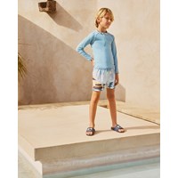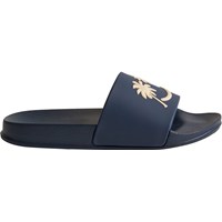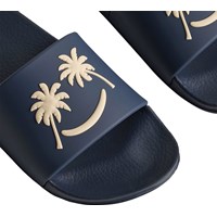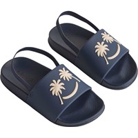 Donkerblauwe badslippers met witte palmbomen als ogen en een glimlach, brede voetband en gevormd voetbed. Waterafstotend en ideaal voor zwembad en strand. Maten 23/24 en 25/26 hebben een hielband die zorgt voor een stabiele pasvorm voor de kleinsten.