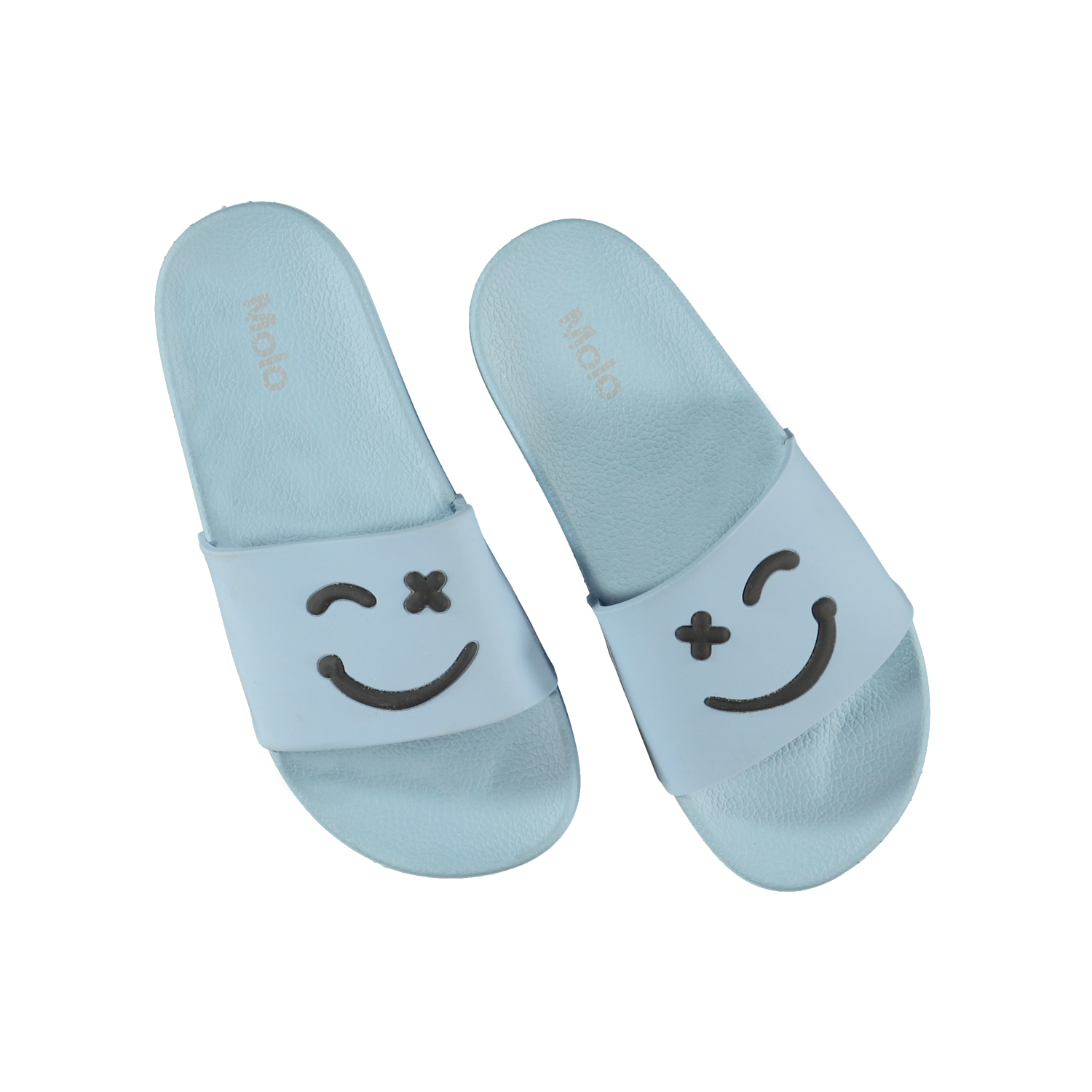Molo’s Zhappy badslippers zijn onmisbaar in de hitte van de zomer wanneer je voeten frisse lucht nodig hebben. Deze badslippers zijn lichtblauw met zwarte smiley’s. De sandalen hebben een elastische hielband in de maten 23/24 en 25/26.