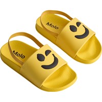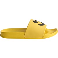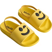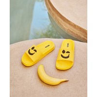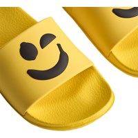 Gele badslippers met een zwarte smiley, brede voetband en gevormd voetbed. Waterafstotend en ideaal voor zwembad en strand. Maten 23/24 en 25/26 hebben een hielband die zorgt voor een stabiele pasvorm voor de kleinsten.