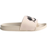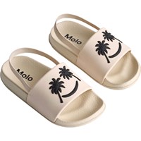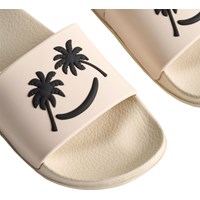 Crèmekleurige badslippers met zwarte palmbomen als ogen en een glimlach, brede voetband en gevormd voetbed. Waterafstotend en ideaal voor zwembad en strand. Maten 23/24 en 25/26 hebben een hielband die zorgt voor een stabiele pasvorm voor de kleintjes.