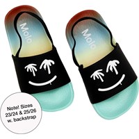 Kleurrijke badslippers met zwarte emoji met ogen van palmbomen. De badslippers zijn waterdicht, dus perfect om mee te nemen naar het zwembad of naar het strand.