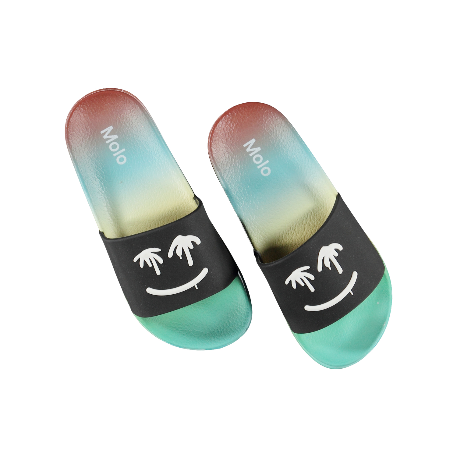 Kleurrijke badslippers met zwarte emoji met ogen van palmbomen. De badslippers zijn waterdicht, dus perfect om mee te nemen naar het zwembad of naar het strand.