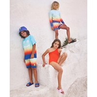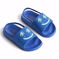 Blauwe badslippers met een brede voetband en voorgevormd voetbed. Deze badslippers zijn waterbestendig, waardoor het perfect is voor naar het zwembad of het strand. De voetband heeft een lichtblauw lachend gezicht met palmbomen als ogen. Maten 23/24 en 25/26 hebben een handige elastische hielband die zorgt voor een comfortabele pasvorm.