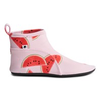 Roze lichtgewicht waterchoenen voor de kleintjes van gerecycled polyester, die kleine voetjes beschermen tegen scherpe schelpen en kiezels terwijl ze voor de eerste keer de zee verkennen. De waterschoenen hebben een duurzame en antislip rubberen zool die zorgt voor een goede grip, en een trekbandje aan de achterkant waardoor het gemakkelijk aan en uit te trekken is. De waterschoenen hebben een all over print van rijpe watermeloenen.