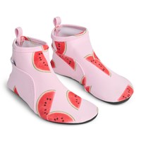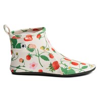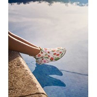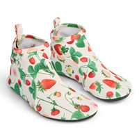 Witte lichtgewicht waterchoenen voor de kleintjes van gerecycled polyester, die kleine voetjes beschermen tegen scherpe schelpen en kiezels terwijl ze voor de eerste keer de zee verkennen. De waterschoenen hebben een duurzame en antislip rubberen zool die zorgt voor een goede grip, en een trekbandje aan de achterkant waardoor het gemakkelijk aan en uit te trekken is. De waterschoenen hebben een all over print van verse rode aardbeien.