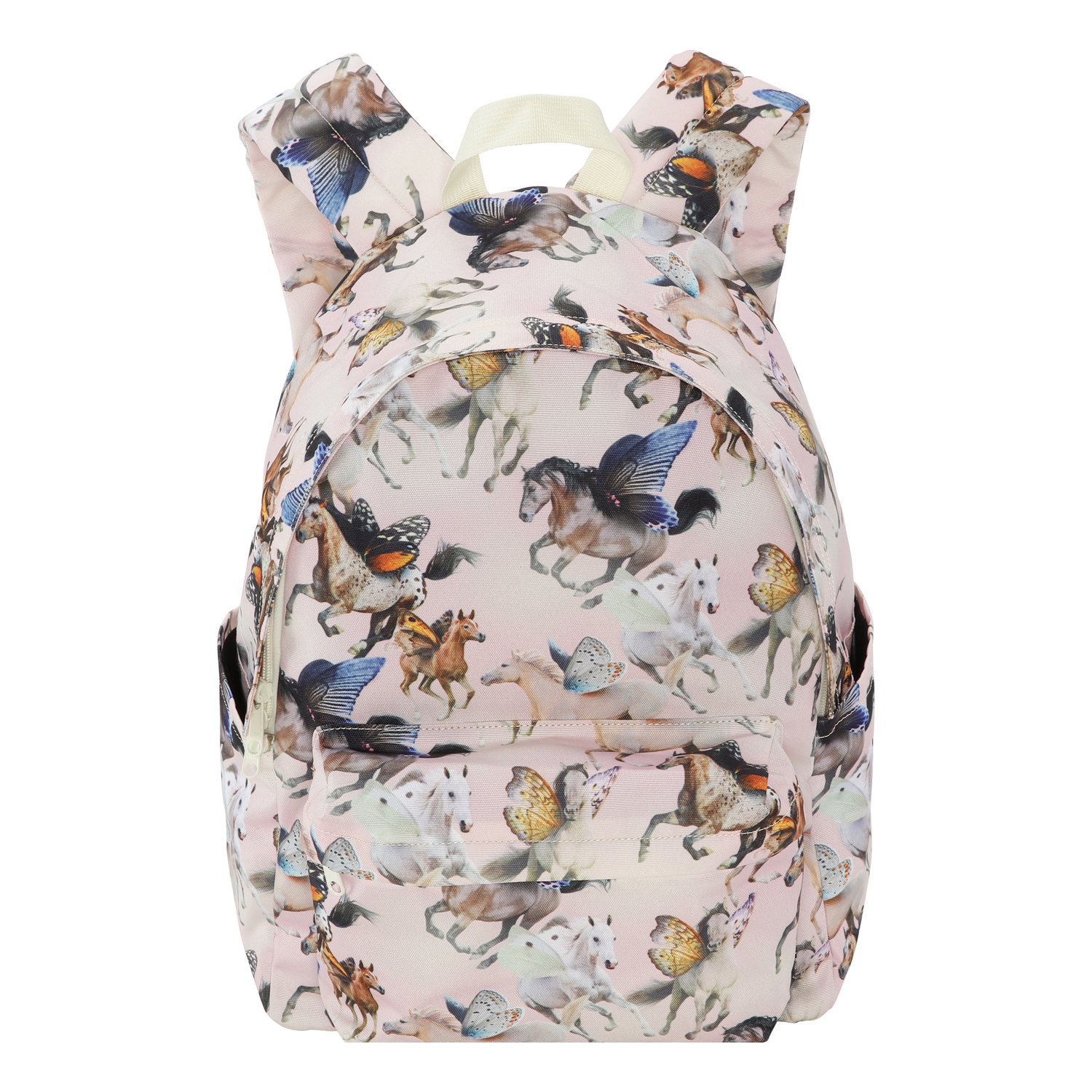 Ruime roze rugzak met de Fairy Horse print waarop galopperende paarden staan met vlindervleugels. De rugzak is ruim en biedt veel opbergruimte, inclusief een gewatteerd vak om je laptop of tablet te beschermen. Daarnaast is hij uitgerust met een voorvak met ritssluiting, flesvakken aan beide zijden en gewatteerde rug- en schouderbanden. Ook heeft de rugzak een verstelbare borstriem die helpt om het gewicht gelijkmatig te verdelen. De afmetingen zijn 30 x 17 x 42 en de inhoud is 21L.