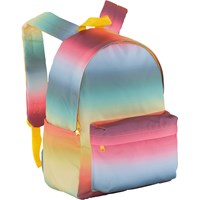 Ruime rugzak in een regenboogprint in vele kleuren. De materialen zijn gemaakt van gerecycled polyester. De rugzak heeft een buitenvak op de achterkant, een ritssluiting, vakken aan beide zijkanten voor bijvoorbeeld een flesje water, een gevoerde rug, een lus en verstelbare schouderbanden. Aan de binnenkant aan de achterkant zit een vak voor een laptop, tablet of een bijzondere tekening die niet gevouwen mag worden.