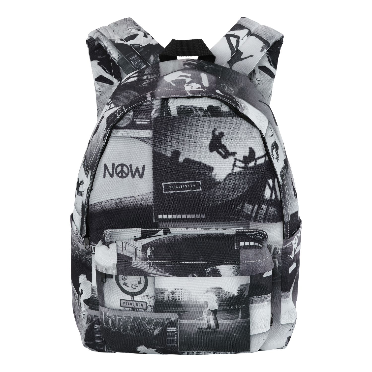 Ruime rugzak in zwart en wit met een Skate Now print waarop skaters van over de hele wereld op helingen staan. De rugzak is ruim en biedt veel opbergruimte, inclusief een gewatteerd vak om je laptop of tablet te beschermen. Daarnaast is hij uitgerust met een voorvak met ritssluiting, flesvakken aan beide zijden en gewatteerde rug- en schouderbanden. Ook heeft de rugzak een verstelbare borstriem die helpt om het gewicht gelijkmatig te verdelen. Afmetingen: 30 x 17 x 42. Inhoud: 21L.
