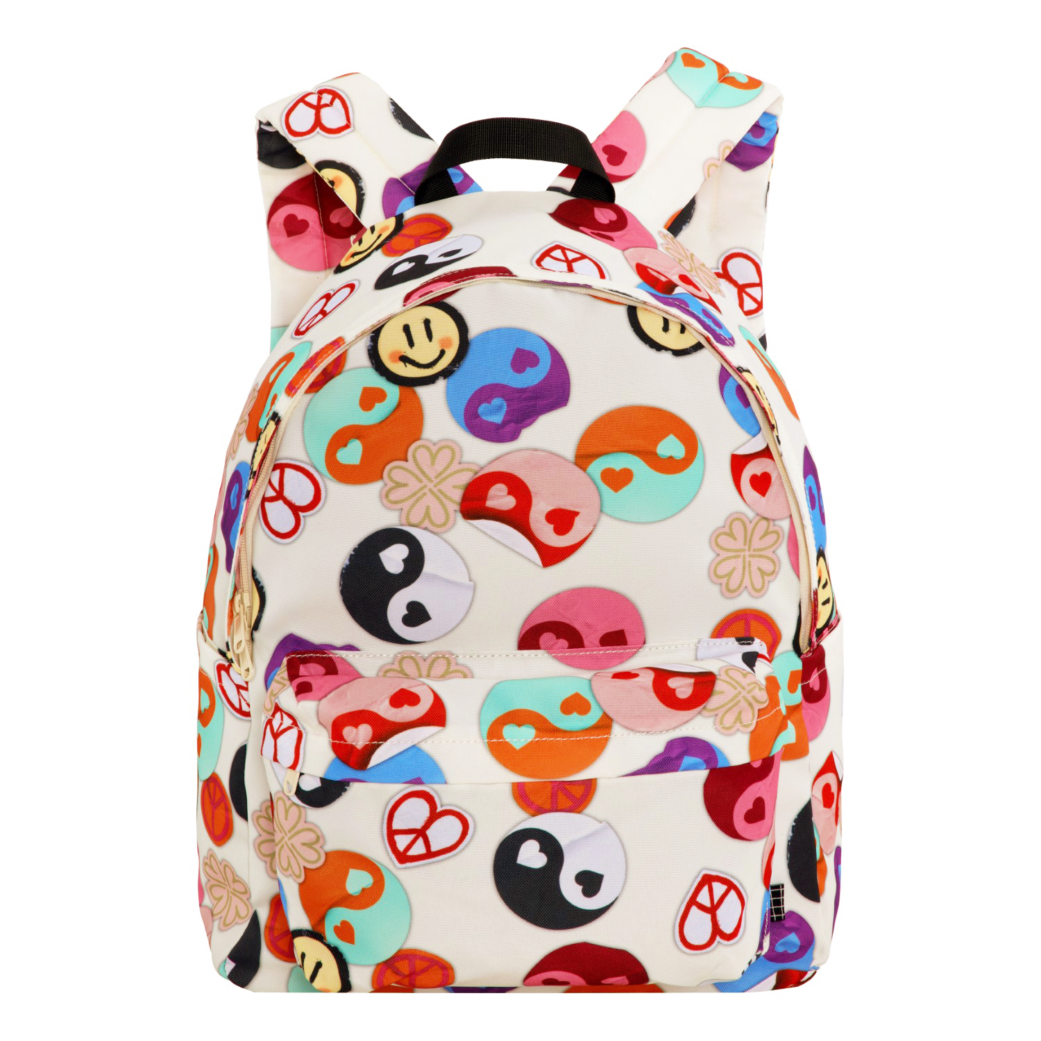 Beige rugzak met kleurrijke Yin Yang symbolen. De rugzak is ruim en biedt veel opbergruimte, inclusief een gewatteerd vak om je laptop of tablet te beschermen. Daarnaast is hij uitgerust met een voorvak met ritssluiting, flesvakken aan beide zijden en gewatteerde rug- en schouderbanden. Ook heeft de rugzak een verstelbare borstriem die helpt om het gewicht gelijkmatig te verdelen. Afmetingen: 30 x 17 x 42. Inhoud: 21L.