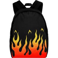 Zwarte rugzak met op de voorkant een vlammotief. De rugzak is ruim en biedt veel opbergruimte, inclusief een gewatteerd vak om je laptop of tablet te beschermen. Daarnaast is hij uitgerust met flesvakken aan beide zijden en gewatteerde rug- en schouderbanden. Ook heeft de rugzak een verstelbare borstriem die helpt om het gewicht gelijkmatig te verdelen. Afmetingen: 30 x 17 x 42. Inhoud: 21L.
