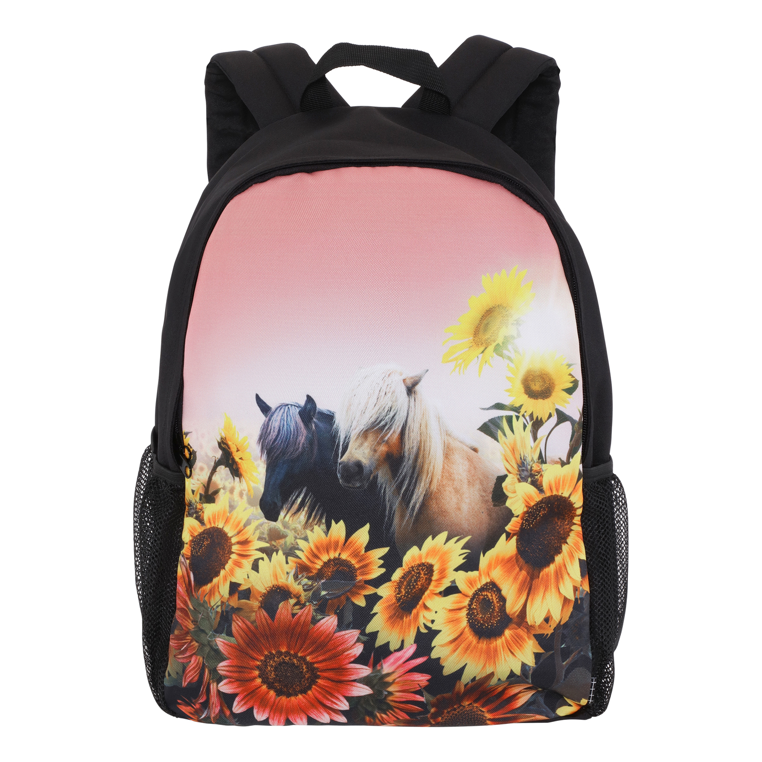 Zwarte rugzak met een print van paarden tussen een heleboel zonnebloemen. Het heeft een voorvak aan de buitenkant met ritssluiting, vakken aan beide zijkanten voor bijvoorbeeld een fles water, een gevoerde achterkant, een lus en verstelbare schouderbanden. De rugzak meet circa 18 cm breed en circa 37cm hoog.