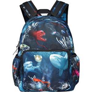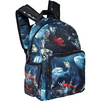 Roomy rucksack in blue with a print of different fish under the ocean's surface. It is constructed in recycled polyester. The rucksack has an exterior front pocket with a zip closure, side pockets for, e.g., a water bottle, padded back, loop and adjustable straps. This Molo product is recycled and constructed in reusable polyester, which is made of used plastic bottles and other waste. The production of reusable polyester requires fewer resources and produces less CO2, making Molo’s recycled rucksack the sustainable choice. The rucksack measures 25 cm wide and 30 cm tall.