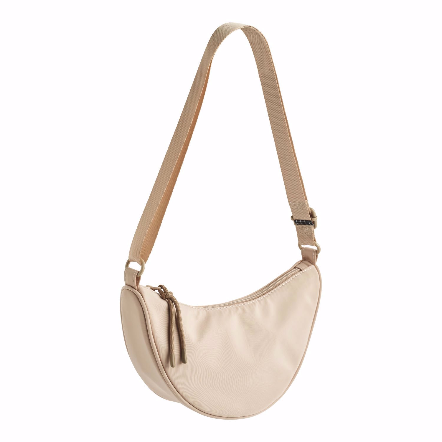 Zandkleurige tas in een halvemaanvorm met verstelbare schouderband, waardoor deze over de schouder, borst of gekruisd gedragen kan worden. De tas heeft een hoofdvak en sluit met een rits. Afmetingen 24 x 14 x 8.