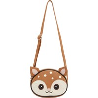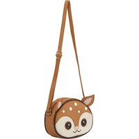 Bruine schoudertas met een lief motief van een hertje op de voorkant. Het heeft een verstelbare schouderband.