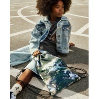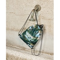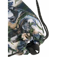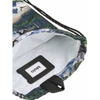 Groen-grijze sporttas met een print van een dinosauriërslandschap, gemaakt van duurzaam polyester met waterafstotende eigenschappen. De tas heeft een reflecterende trekkoordsluiting die ook als schouderbanden fungeert. Aan de bovenkant is hij voorzien van een ophanglus en een klein binnenvakje voor een naamlabel.