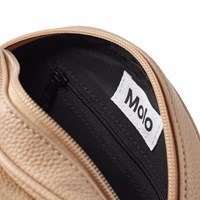Bruine tas met een motief van een dwergkeeshond aan de voorkant. De tas is 18,5 cm breed, 14 cm hoog en 5 cm diep. De tas heeft een verstelbare schouderband en een klein binnenvak met een rits.