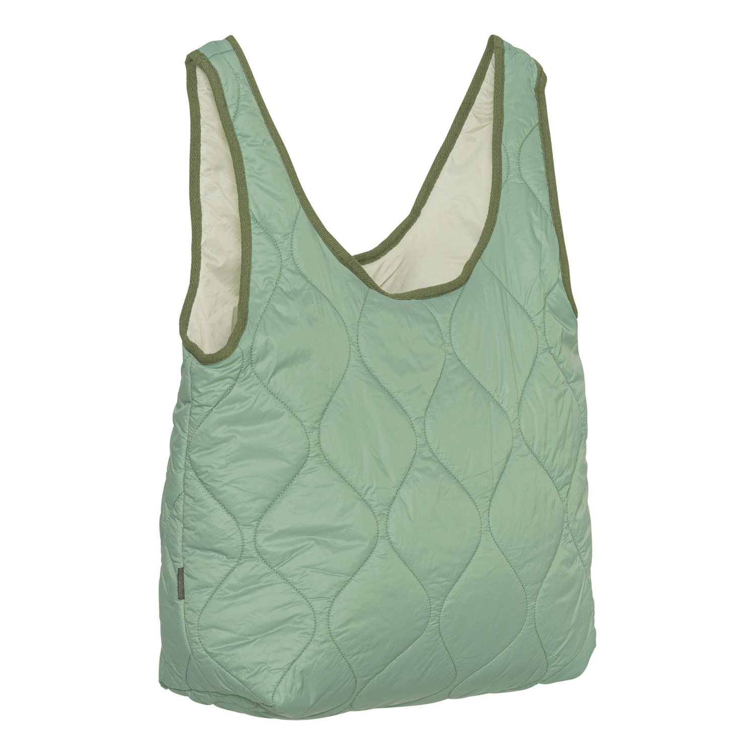 Een groene gequilte tas met donkergroene bies aan de randen en met beige voering.
