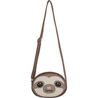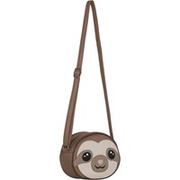 Bruine schoudertas met verstelbare schouderriem. De tas heeft de vorm van het gezicht van een lieve luiaard.