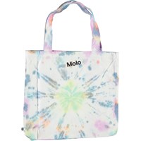 Kleurrijke tie-dye draagtas met tekst aan de voorkant.
