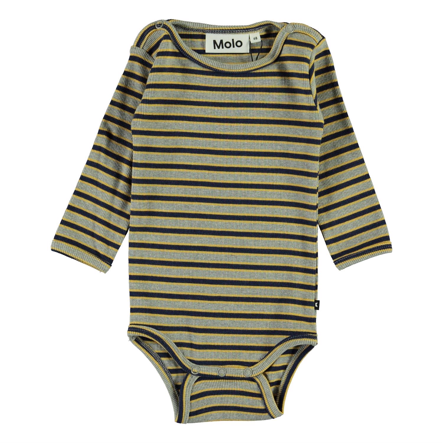 Fair is een romper met lange mouwen in rib met grijze, gele en blauwe strepen. Het heeft drukknopen in de boord en in het kruis.