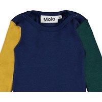 Fair is een romper met lange mouwen in rib met gekleurde blokken. De romper is blauw met een gele en groene mouw. Het heeft drukknopen in de boord en in het kruis.