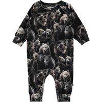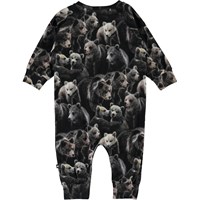 Fairfax is een babypakje met lange mouwen en een print van schattige beren. Het babypakje heeft raglanmouwen en schuine drukknopen in de boord en in het kruis.