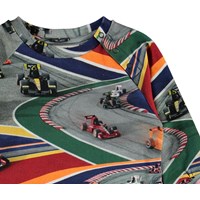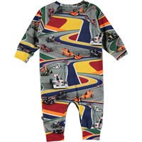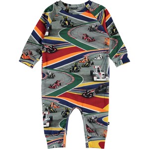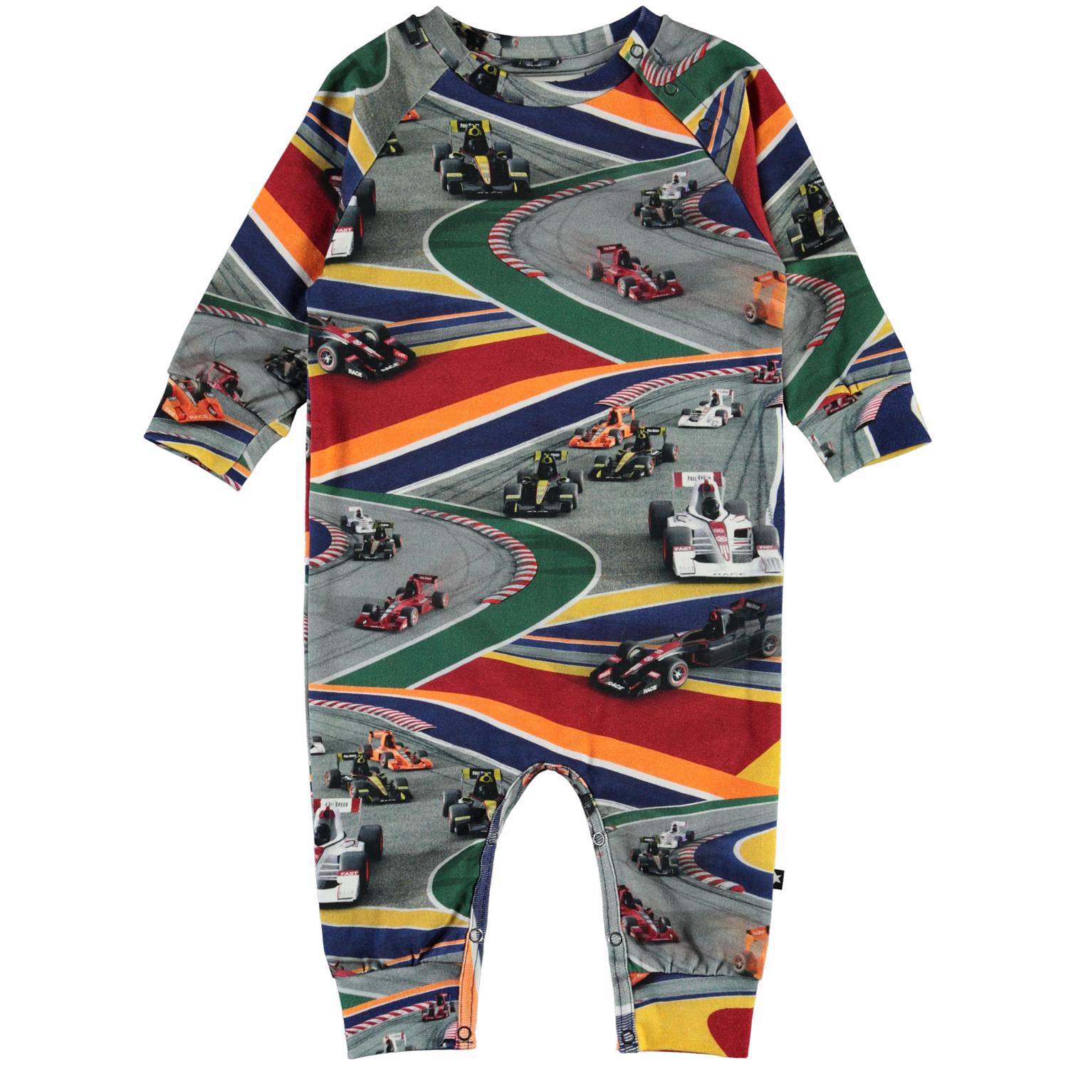 Fairfax is een babypakje met lange mouwen en een print van kleurrijke raceauto's. Het babypakje heeft raglanmouwen en schuine drukknopen in de boord en in het kruis.