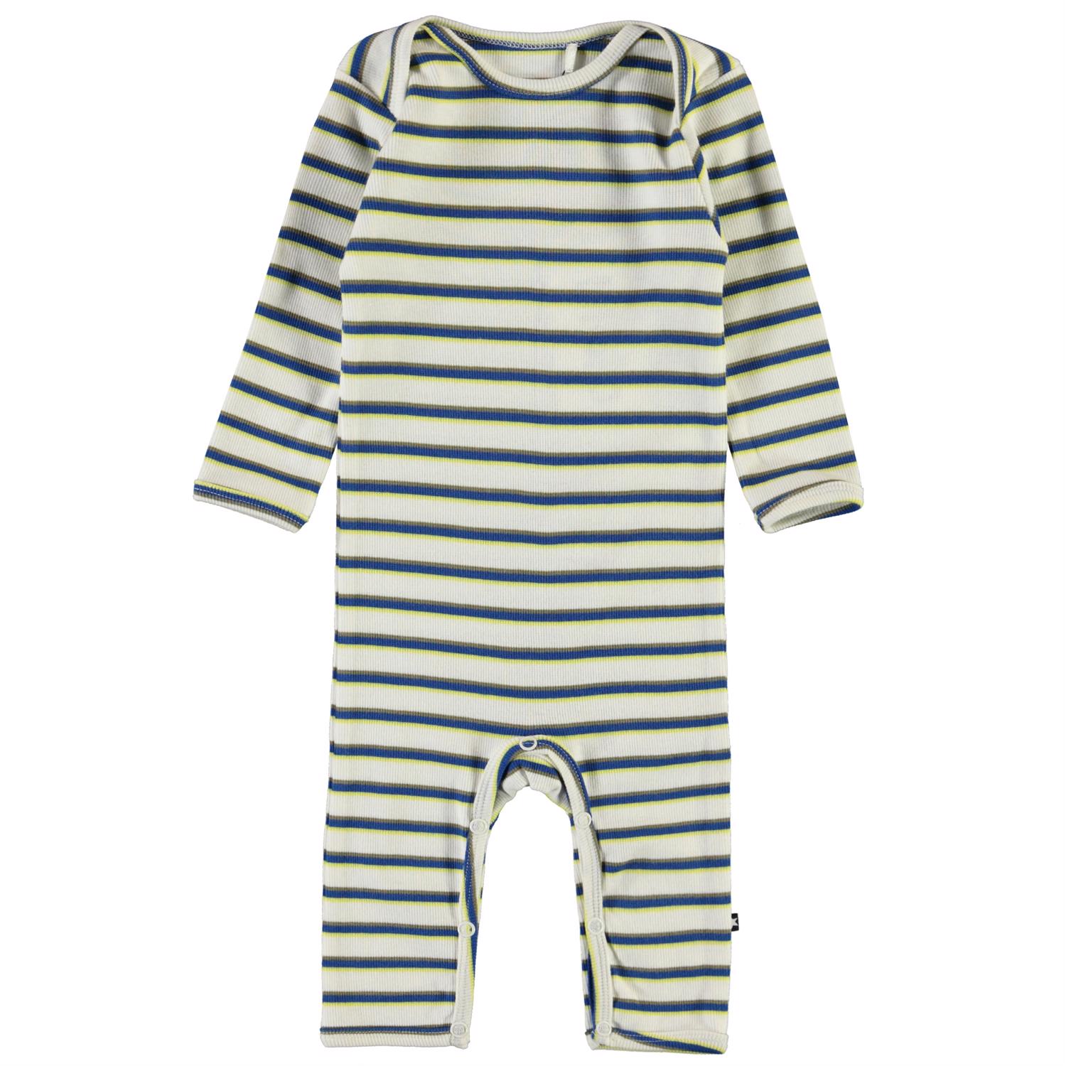 Faso is een wit babypakje met lange mouwen en lange pijpen en smalle blauwe, grijze en gele strepen. Het heeft drukknopen op de schouders en in het kruis.
