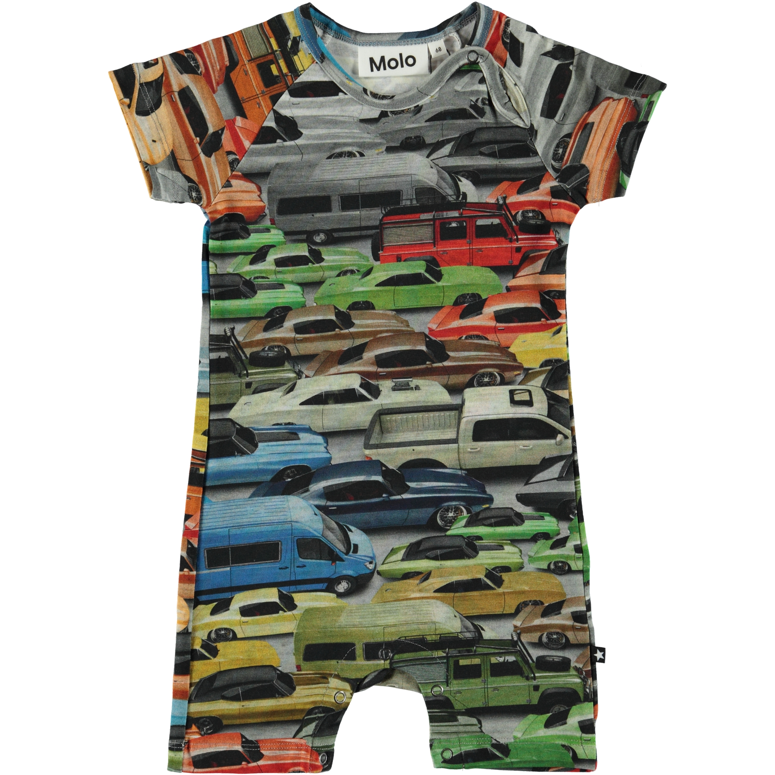 Felton is een babypak met een print van kleurrijke auto’s. Het babypak heeft korte mouwen en pijpen.Er zijn buitenaardse wezens en wilde dieren verborgen in de print. Het heeft drukknopen in de nek en in het kruis.