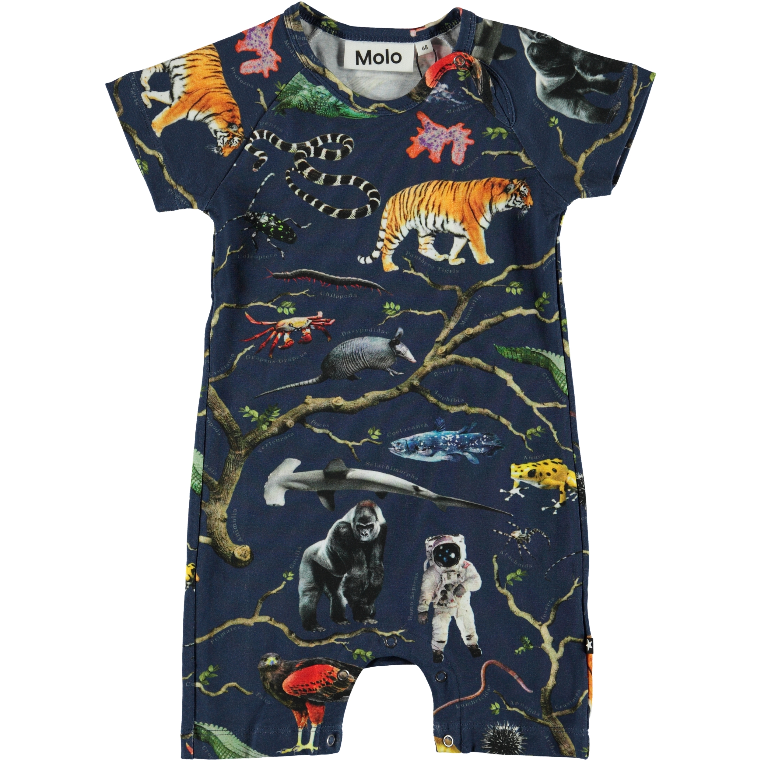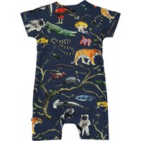 Ontdek de “Three of Life” print op de Felton dit is een babypak met korte mouwen en pijpen.Er zijn buitenaardse wezens en wilde dieren verborgen in de print. Het heeft drukknopen in de nek en in het kruis.