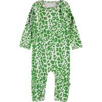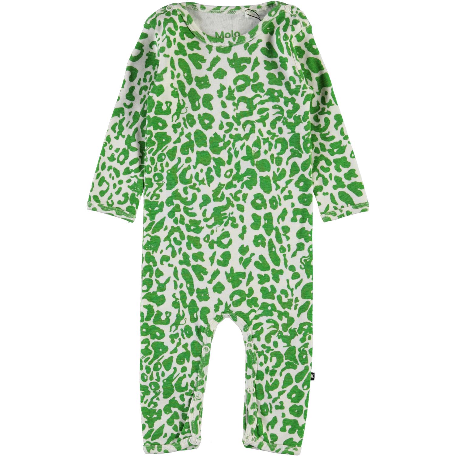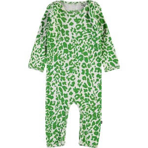 Fenez is een babypakje met lange pijpen en mouwen. Het heeft een groene luipaard print en als je van dichtbij kijkt, zie je verstopte dieren in de print. Het babypakje heeft drukknopen op de schouders en in het kruis.