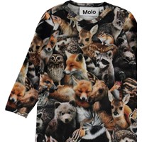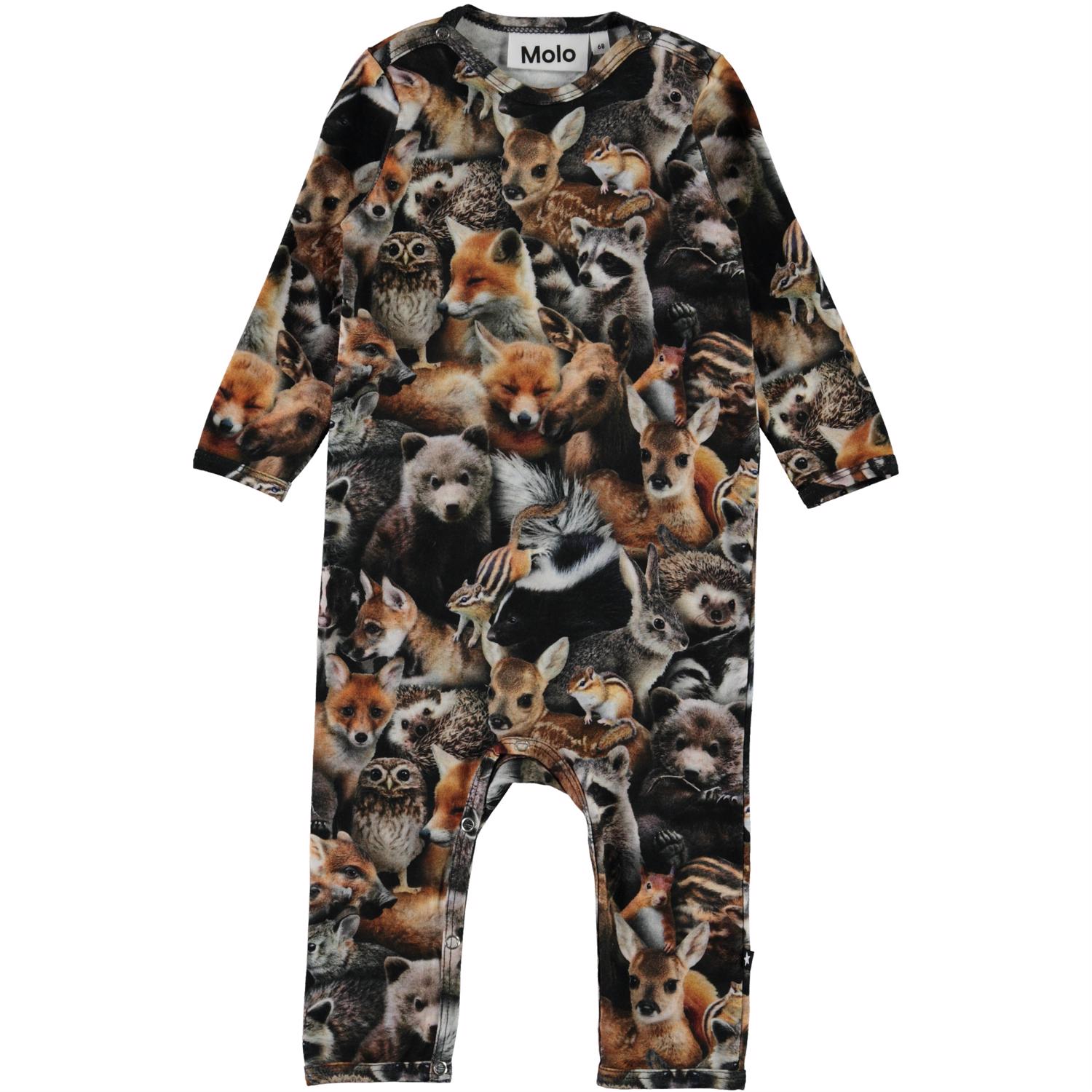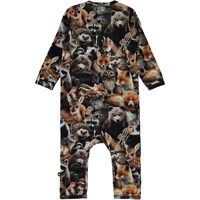 Fenez is een bruin babypakje met lange mouwen en pijpen en met een print van dieren in het bos. Het heeft drukknopen op de schouder en in het kruis.