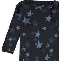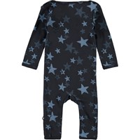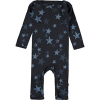 Fenez is een donkerblauwe babypakje met lange mouwen en pijpen met een sterrenprint. Het heeft drukknopen op de schouder en in het kruis.