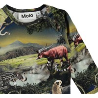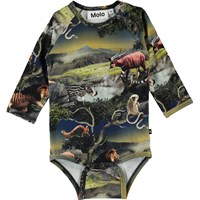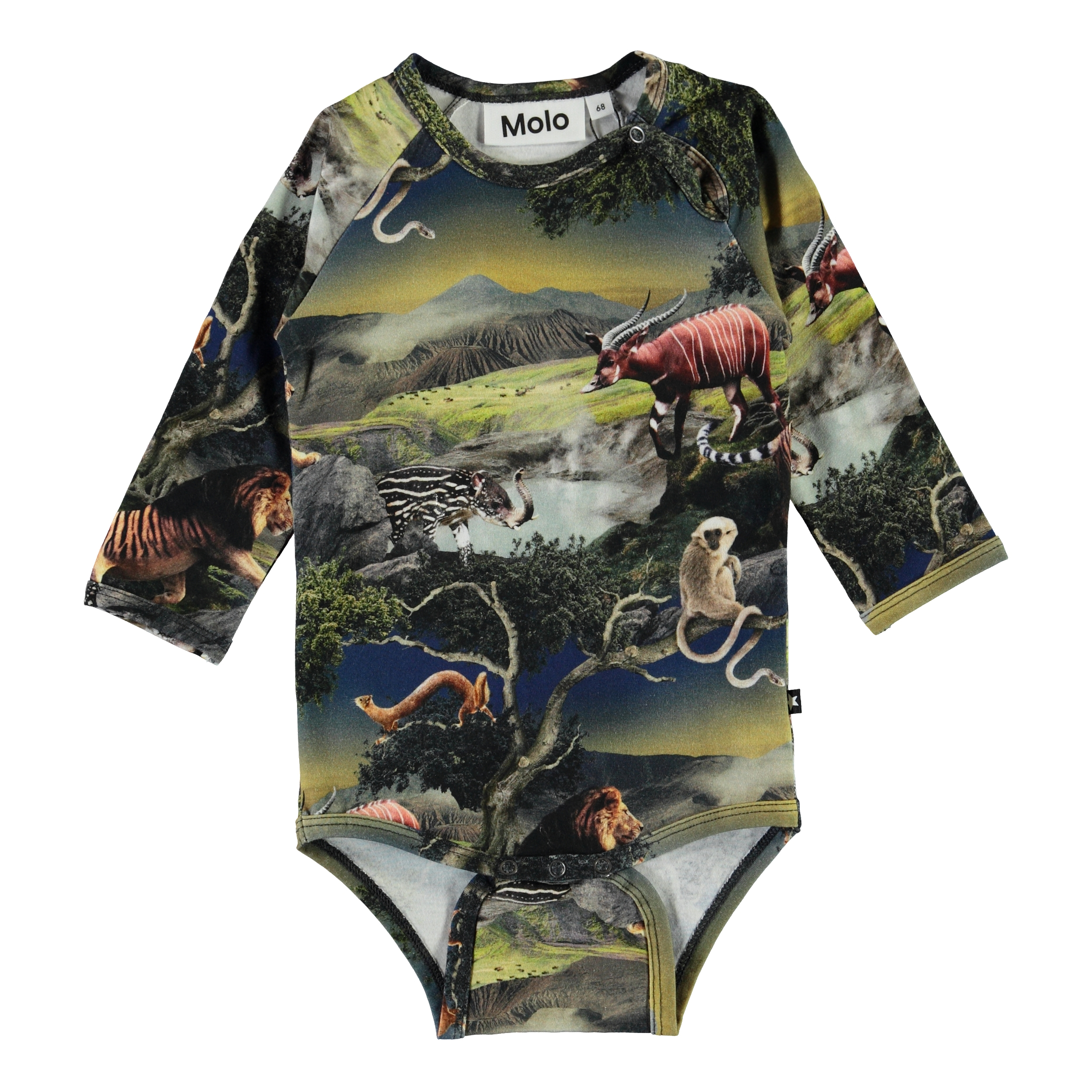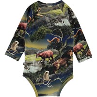Field is een romper met lange mouwen en een print van futuristische dieren. Het heeft drukknopen in de boord en in het kruis.
