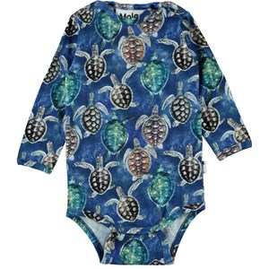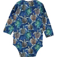 Field is een blauwe baby romper met lange mouwen en een schildpadden print. Het heeft drukknopen op de schouders en in het kruis.