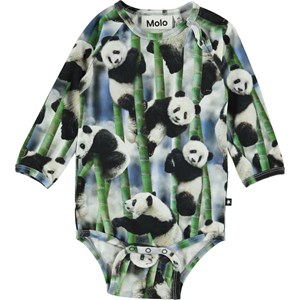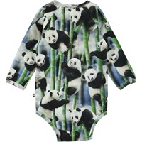 Field is een romper met lange mouwen en een print van panda’s en hun favoriete eten: bamboe. Het heeft drukknopen in de nek en in het kruis.