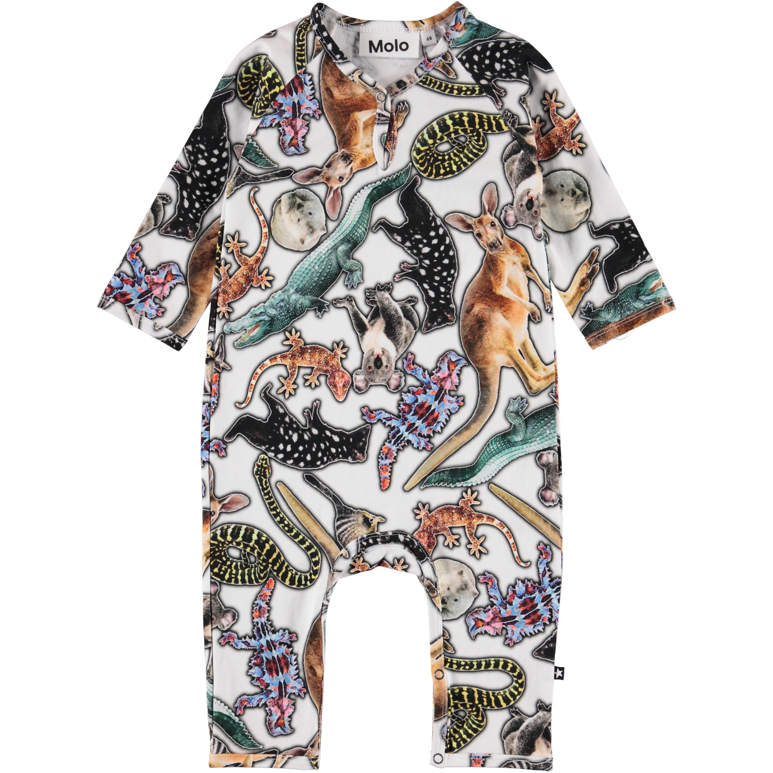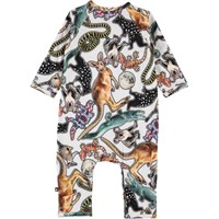 Fleming is een babypak met lange mouwen en een print van wilde dieren in Australië. Het heeft drukknopen in de nek en in het kruis.