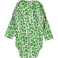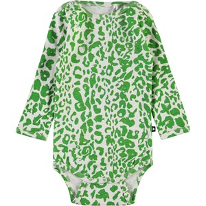 Foss is een groene baby romper met lange mouwen en een groene luipaardprint waar verschillende dieren in verstopt zitten Het heeft drukknopen op de schouders en in het kruis.