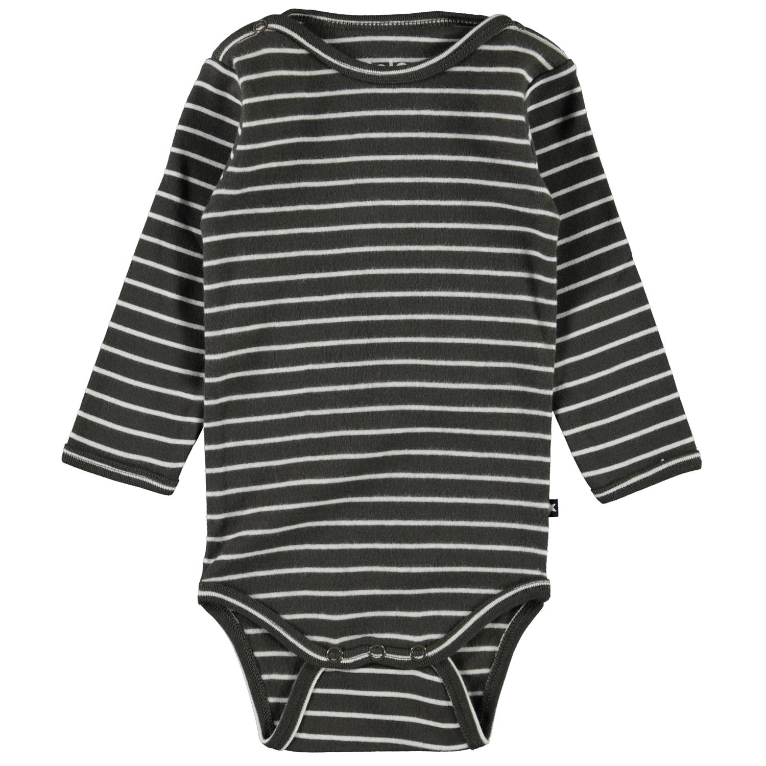 Foss is een donkergrijze rompertje met lange mouwen en smalle witte strepen. Het heeft drukknopen op de schouder en in het kruis.