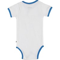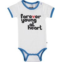 Fossie is een witte romper met korte mouwen en de tekst "Forever young at heart" op de voorkant. Fossie heeft een blauwe biaisband. Het heeft drukknopen in de nek en in het kruis.