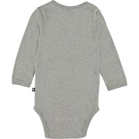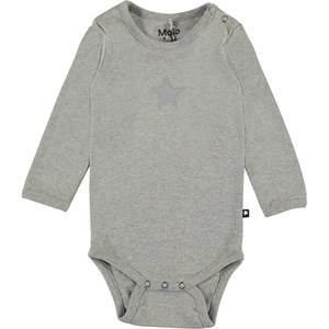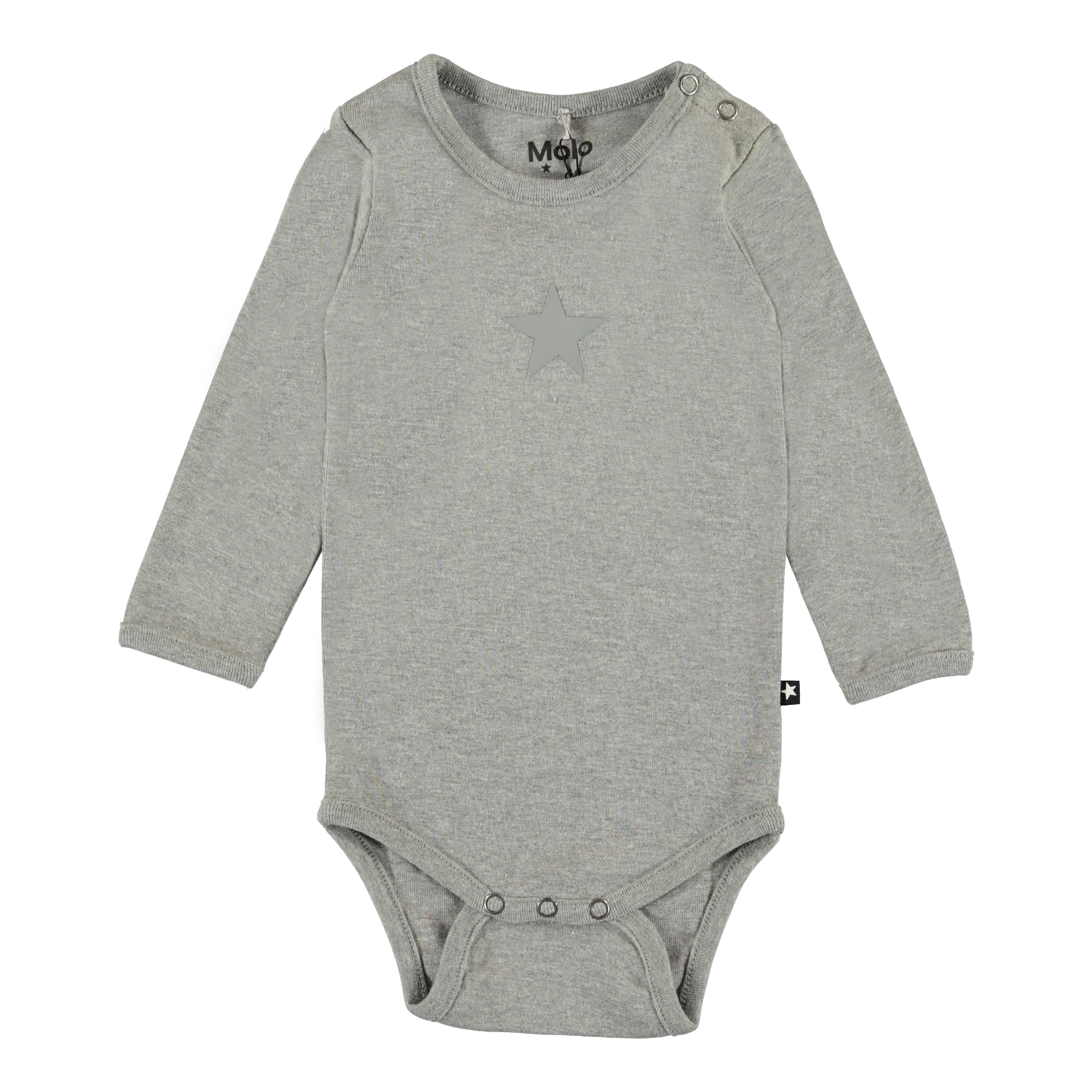 Foss is een grijze romper met lange mouwen en een bedrukte ster op de voorkant. Het heeft drukknopen in de nek en in het kruis.