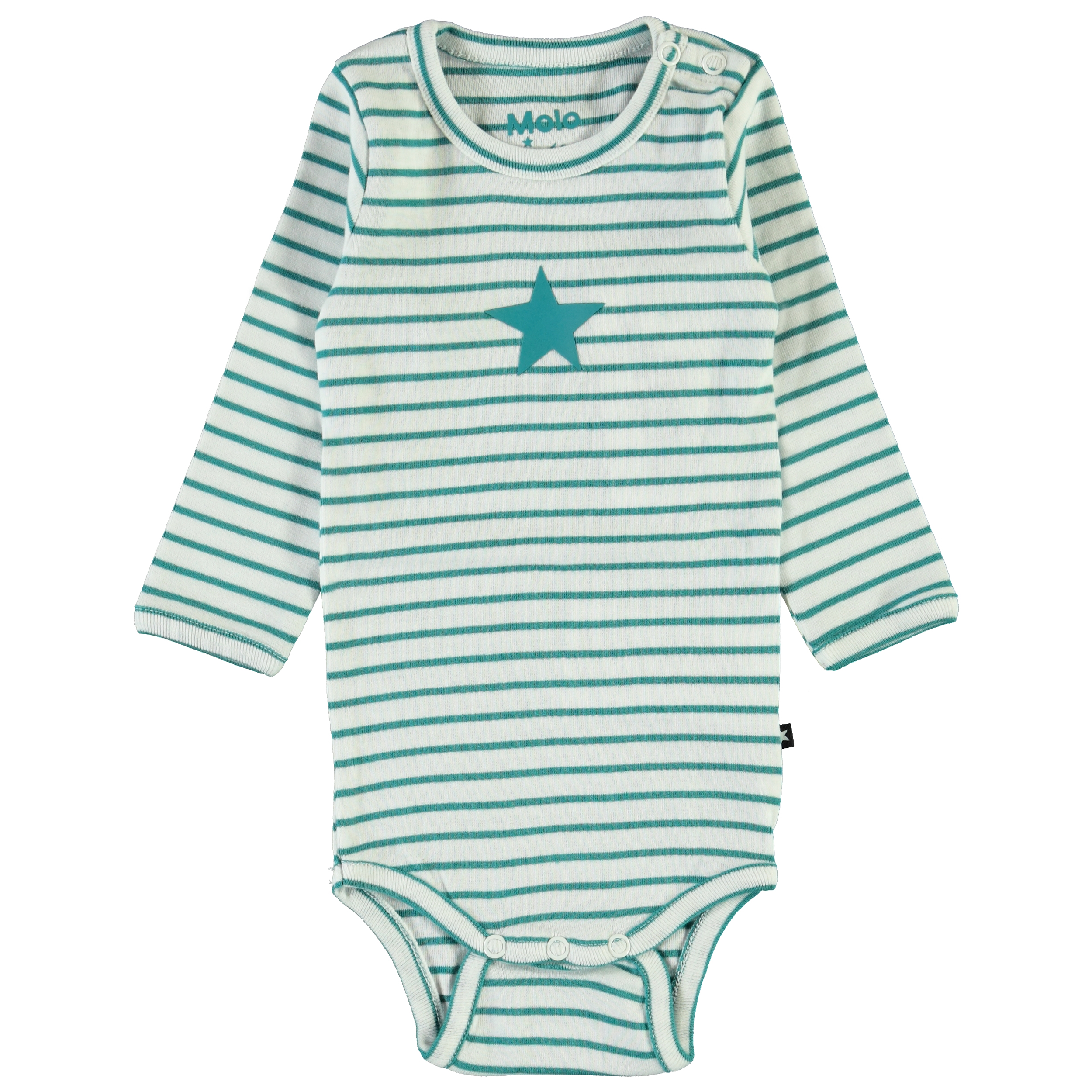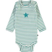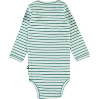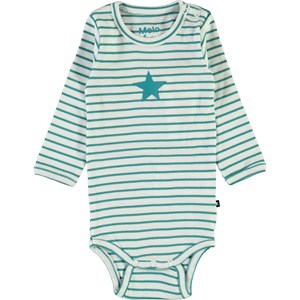 Foss is een groen gestreepte romper met lange mouwen en een bedrukte ster op de voorkant. Het heeft drukknopen in de nek en in het kruis.