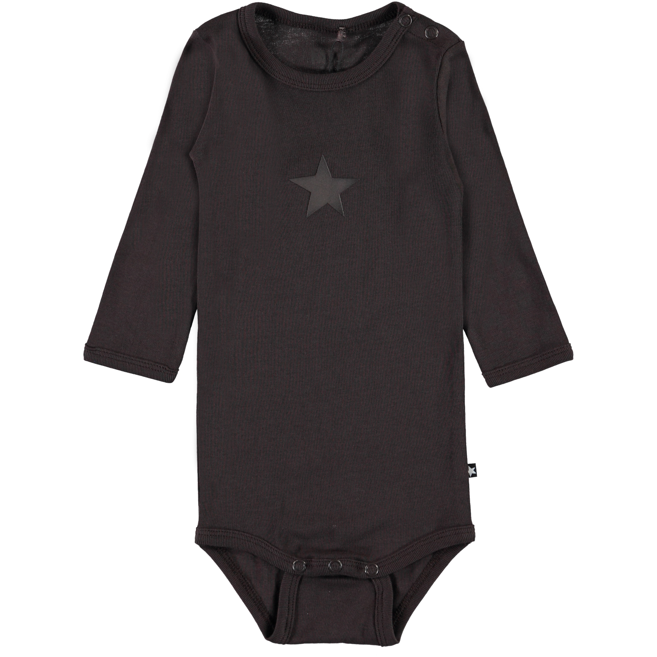 Foss is een donkerbruine romper met lange mouwen en een ster op de voorkant. Het heeft drukknopen in de boord en in het kruis.