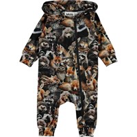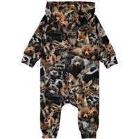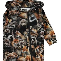 Fowo is een babypakje met een print van verschillende bosdieren. Het heeft een capuchon en een schuine ritssluiting aan de voorkant.