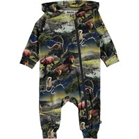 Fowo is een babypakje met een futuristische dierenprint. Fowo heeft een capuchon en een schuine ritssluiting aan de voorzijde.
