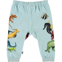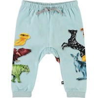 Sabbe is een ruime en lichtblauwe babybroek met een dierenprint aan de zijkanten. Het heeft koordjes in de taille.